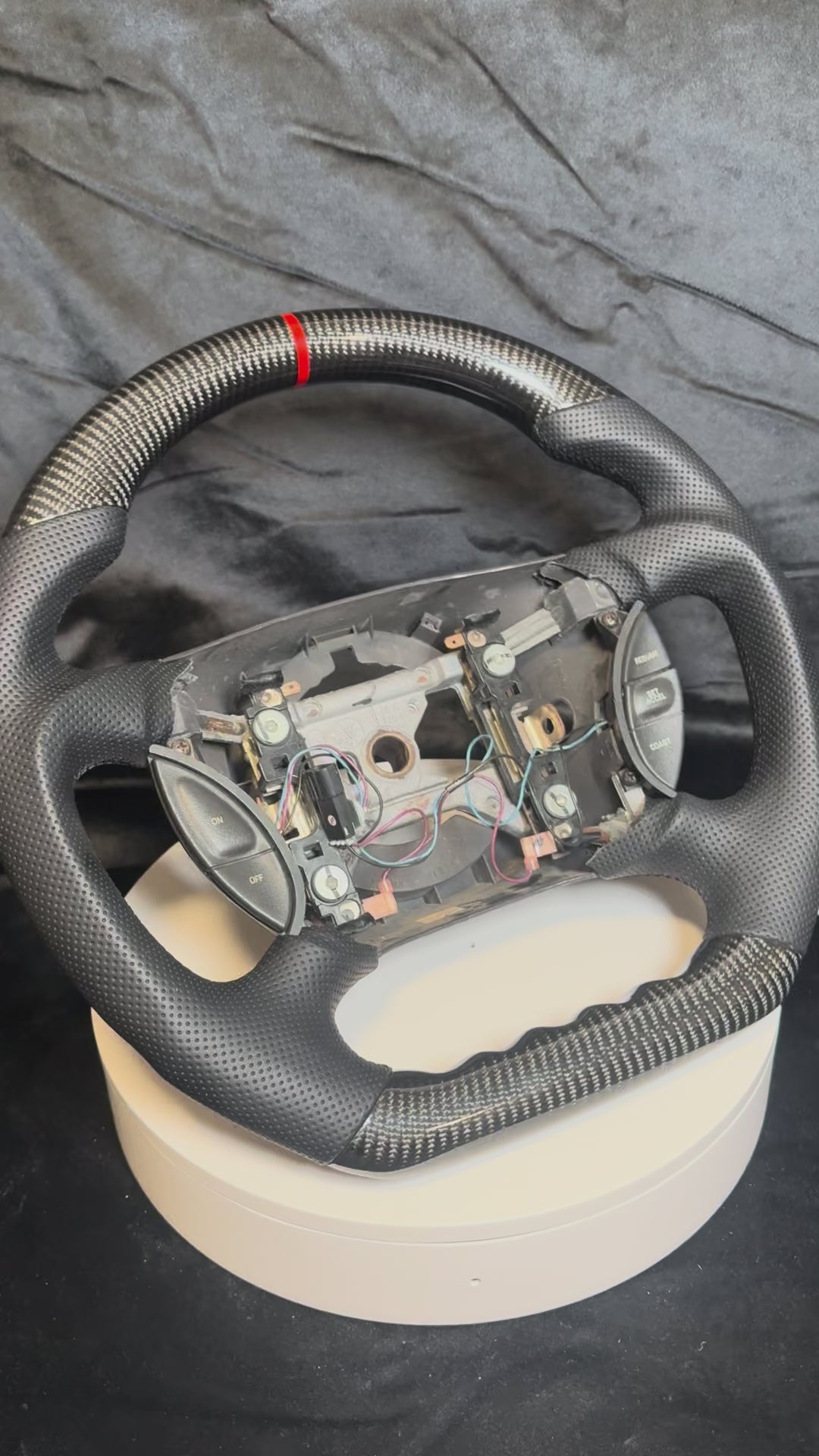 Flat bottom, Gloss carbon, perforated leather, black stitching, red stripe