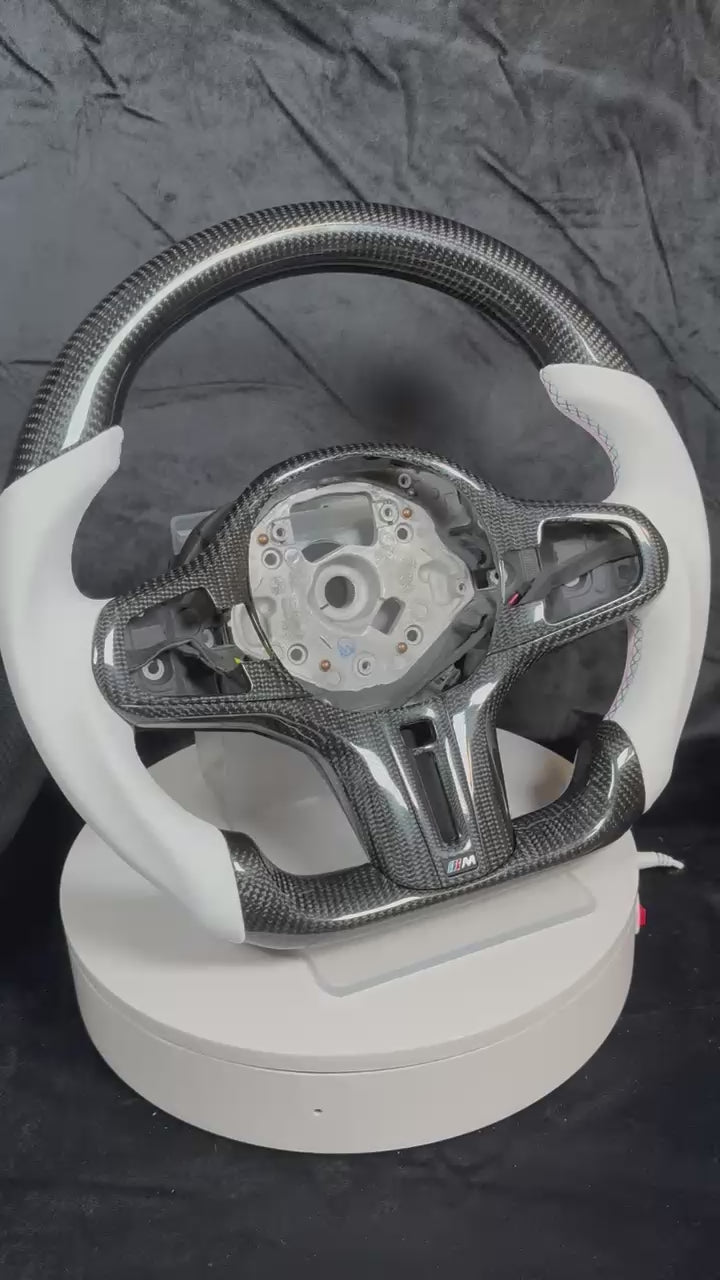 Flat bottom, Gloss carbon, White smooth leather, M stitching, Carbon bezel, Heated retain