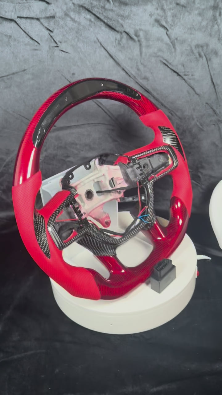 Flat bottom, Red gloss carbon, Red Perforated leather, red stitching, gloss carbon inlay, bezel, heated retain, LED
